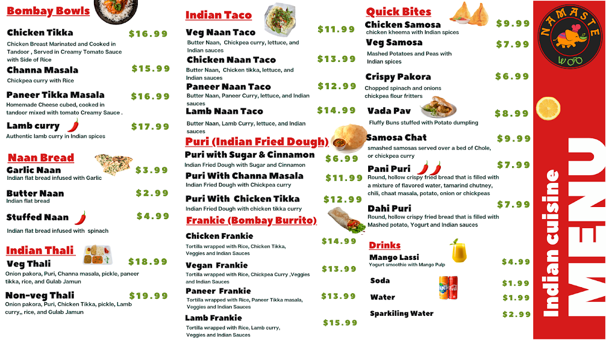 Drinks at Namaste Woo are not to be overlooked, either. From the aromatic Bombay Cutting Chai to the refreshing Mango Lassi, each sip is crafted to complement the robust flavors of the food. The Saffron Latte offers a unique twist that can elevate your dining experience, making it a must-try for anyone looking to indulge in authentic Indian beverages.